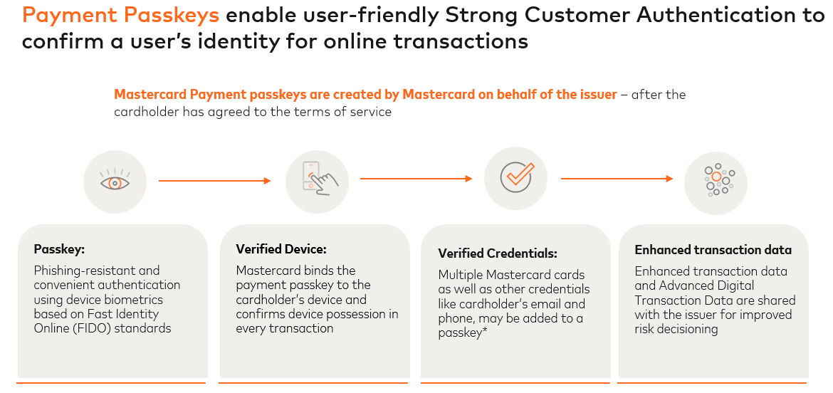 - Cardholders create payment passkeys with Mastercard and use them to securely verify their identity using biometrics, such as fingerprint or facial recognition.